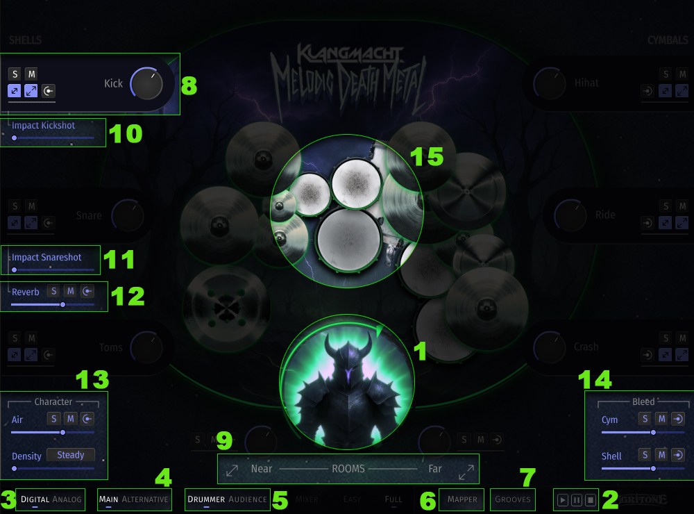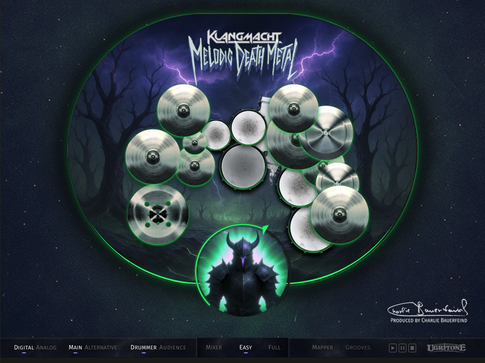 - Demo Song: Press the small Play Button in the lower right corner to hear the demo MIDI we've provided.  You can turn the big knob while listening listen what happens. This will give you a quick taste of the kit's versatility.